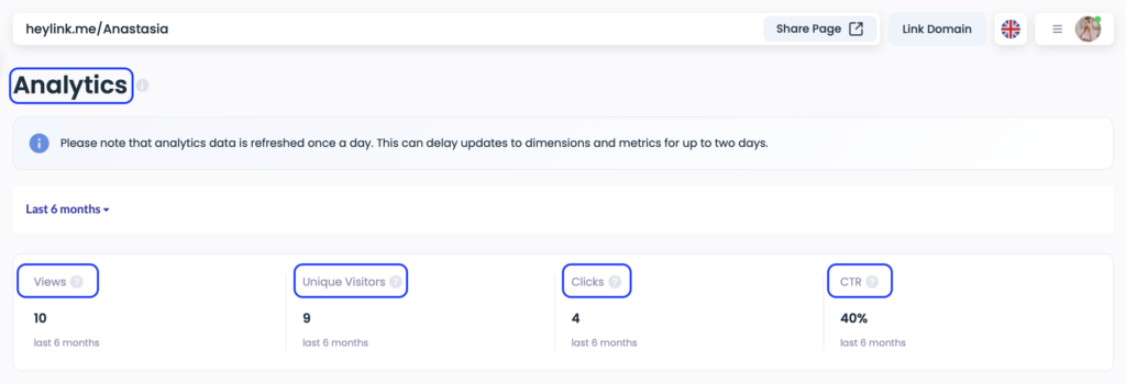 - CTR (Click-Through Rate): Clicks divided by views, expressed as a percentage. CTR helps you compare placements and creatives at scale. Example: if a page has 10 views and 20 link clicks, CTR = (20 / 10) * 100 = 200%. HeyLink.me shows analytics ranging from the last week up to six months.