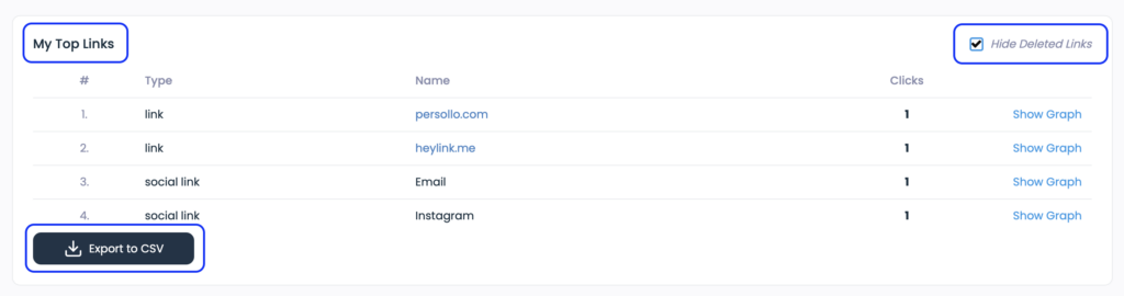 Top-performing links shows: which links/blocks on your HeyLink.me page collected the most clicks and conversions.