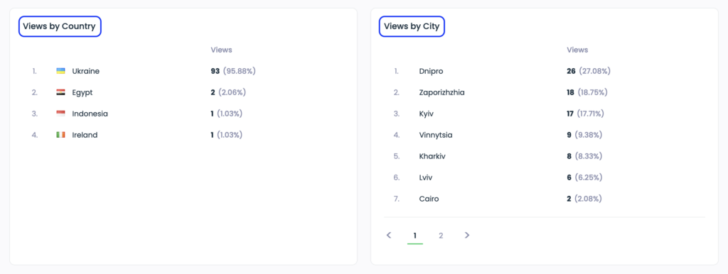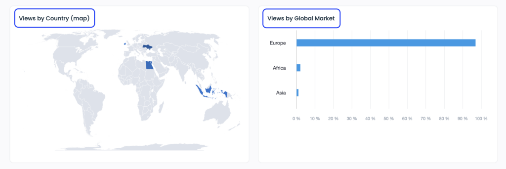 Visitor location (views by countries and cities) shows geographic distribution of your audience at country and city levels.